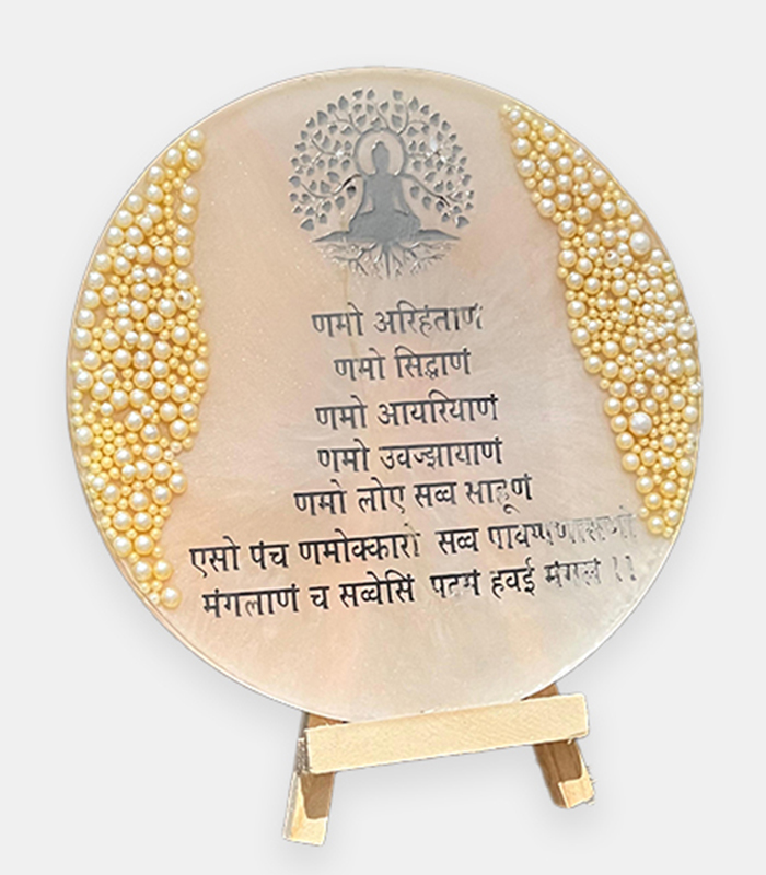 Sometimes, the calm you need starts with what you surround yourself with. This Namokar Mantra Frame was designed to do just that. It features the entire Namokar mantra and displays it in clear format. It is designed to bring a peaceful and spiritual energy into your space. Embellished with pearl beads on both sides, it gives a smooth and polished finish. This Mantra Frame is ideal for creating a calming corner in your home, office or pooja space and also acts as a meaningful gift for housewarmings, religious events or festive occasions. It also lightweight, durable and easy to move or reposition with the stand that come with it.